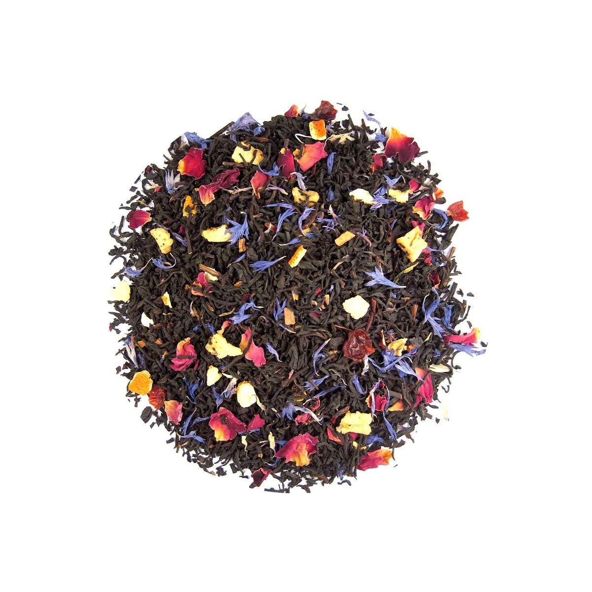 Zwarte Thee, stukjes appel, korenbloembloesem, rozenblaadjes, kaneel, rozebottel, aroma.