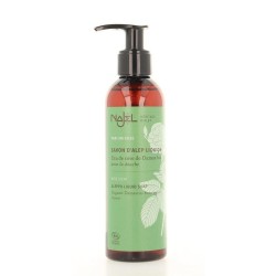 De verpakking van deze Aleppo-zeep in vloeibare vorm is voorzien van een pomplacon en daardoor zeer praktisch en hygiënisch in gebruik.