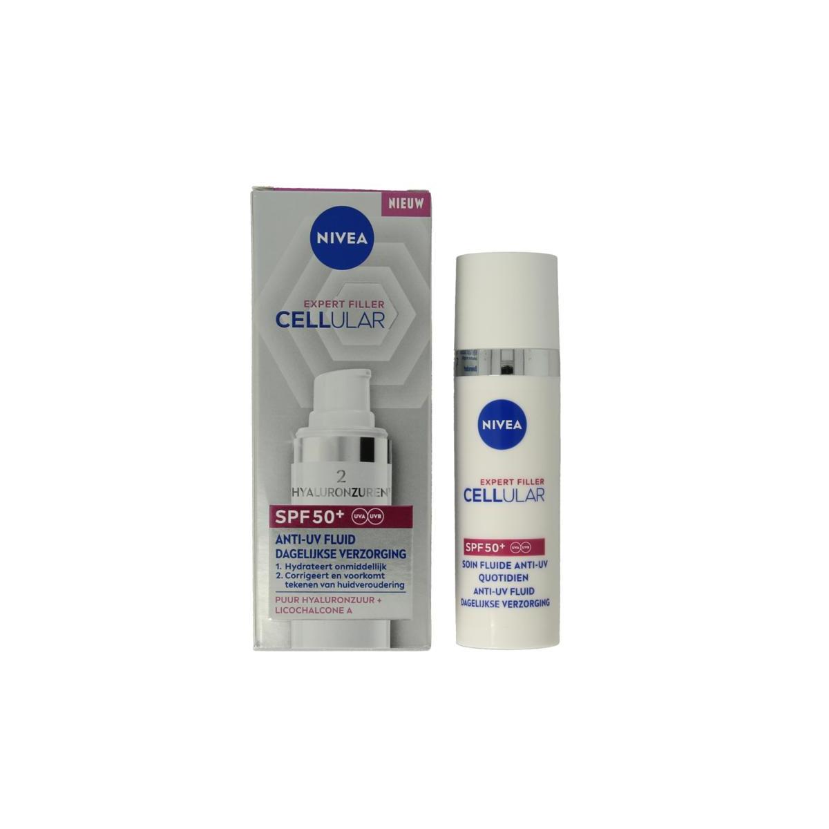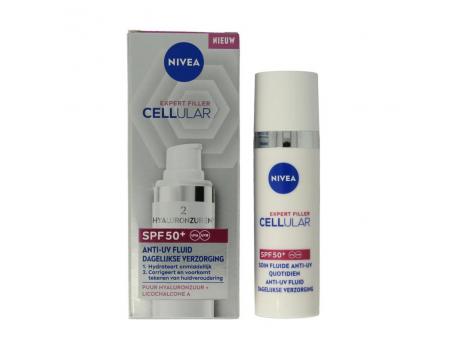 NIVEA Cellular Expert Filler Anti-UV Dagelijkse Verzorging SPF50+ hydrateert onmiddellijk en corrigeert en voorkomt tekenen van huidveroudering.