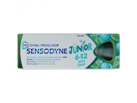 Sensodyne Junior voor kinderen van 6 tot 12 jaar. geeft 24 uur bescherming tegen gaatjes. Met fluoride in een milde muntsmaak.