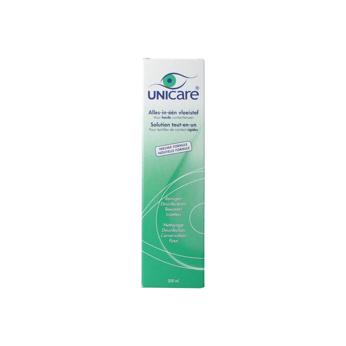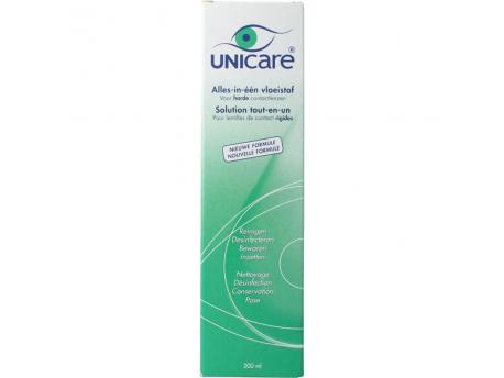 Unicare is een uitgekiende vloeistof die met behulp van filtratie gesteriliseerd is. De vloeistof is geschikt voor het dagelijks reinigen, desinfecteren, bewaren en inzetten van harde contactlenzen. Het is in principe geschikt voor alle soorten harde contactlenzen. De vloeistof is zacht voor de ogen door de neutrale pH waarde. De pH waarde is gelijk aan de pH waarde van het traanvocht.